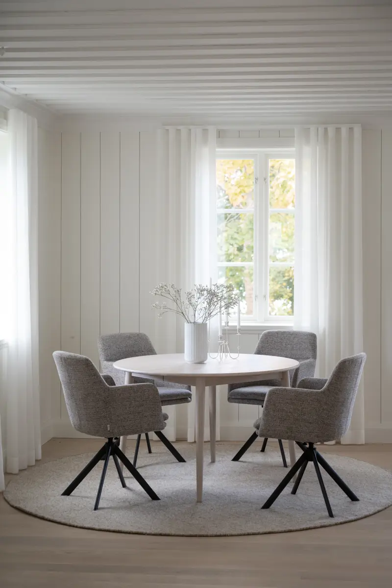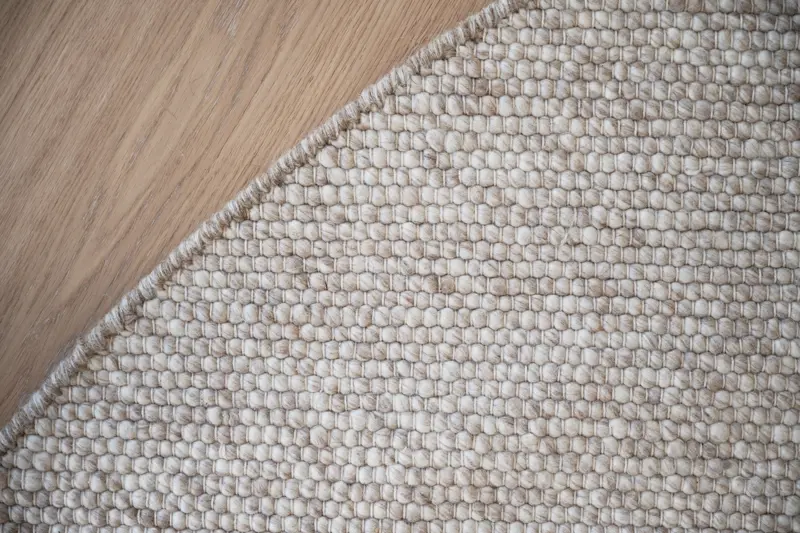 The Auckland carpet Ø250 cm in beige wool is a durable, high-quality handwoven rug. Made of 100% wool, it is warm and comfortable to walk on. Auckland is available in multiple sizes and, thanks to its natural colours, is easy to place in various rooms of your home. A rug pad is recommended. It is also available in natural and grey colours.For the Willard lounge sofa, you can purchase a corner module to create a corner sofa. Here, it is upholstered in the beautiful and trendy bouclé fabric Alice light beige (#01). The design is soft and rounded, providing a warm and inviting feeling. Willard is a modular sofa that allows you to customize it according to your preferences. It is available in two standard fabrics, Brenda Beige and Alice Light Beige, but can be ordered in a variety of fabrics and colours. The individual modules are not fully upholstered, which means they cannot be placed as standalone pieces. The collection is manufactured in Europe and is FSC® certified, indicating that all wood comes from responsible forestry practices.