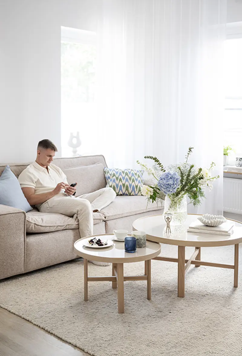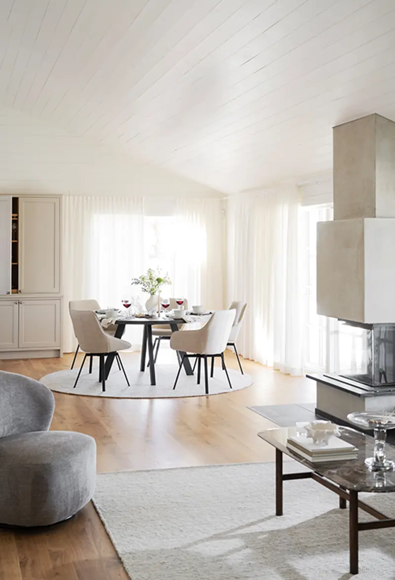 Schaffen Sie ein einheitliches Gefühl und einen Zusammenhang, indem Sie bestimmen, welchen Stil und welches Gefühl Sie in Ihrem neuen Zuhause vermitteln möchten. Danach können Sie Farben und Materialien hinzufügen, die harmonieren. Ein Tipp von uns ist, sich an denselben Unterton zu halten und dann Kontraste zwischen den Möbeln und den Einrichtungsdetails zu schaffen. Für weitere Tipps zur Farb- und Materialwahl sowie zum Mischen verschiedener Holzfarben können Sie sich unsere Anleitung ansehen.