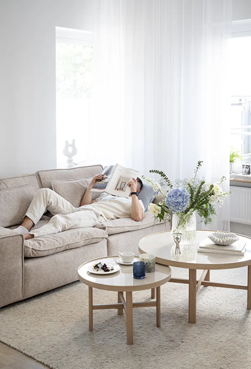 Viele neu gebaute Wohnungen haben durchdachte Grundrisse, bei denen jeder Raum sorgfältig für die verschiedenen Bedürfnisse des Hauses gestaltet ist. Viele stellen das Sofa gegen eine Wand, die mit Spiegeln oder Bildern dekoriert werden kann, um eine ästhetisch ansprechende Einrichtung zu schaffen. Wenn Sie sich entscheiden, das Sofa an der Wand zu platzieren, empfehlen wir Ihnen, das Sofa etwas von der Wand wegzubewegen, um ein zusätzliches Raumgefühl zu schaffen.