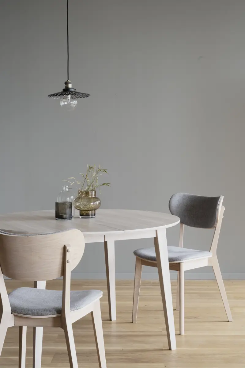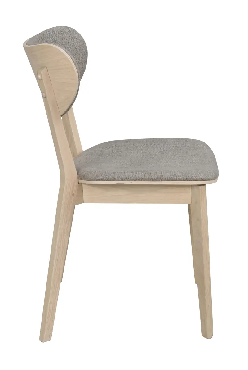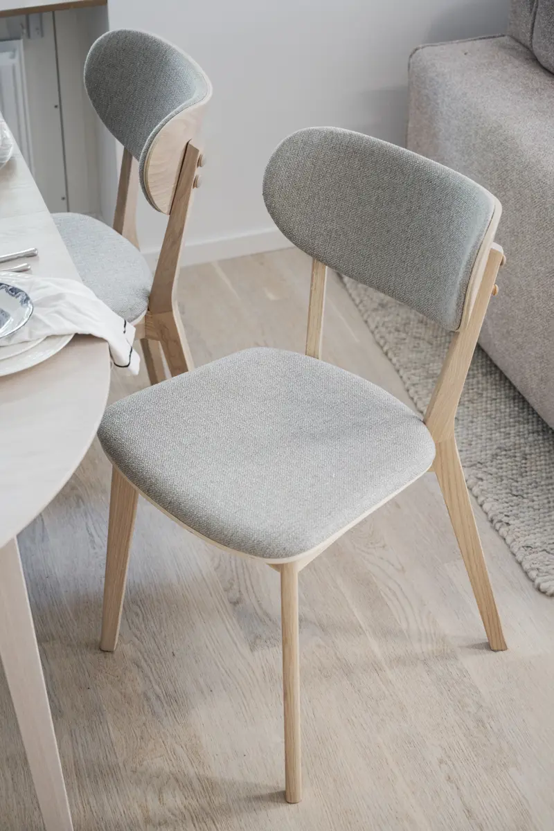 Der Stuhl Kato aus massiver, weiß pigmentierter Eiche atmet skandinavisches Design und hat eine gepolsterte Sitzfläche und Rückenschale aus strapazierfähigem hellgrauem Stoff. Die abgerundete Rückenlehne macht den Holzstuhl sehr bequem, perfekt für den Essbereich, wo stilvolles Design auf gemütlichen Komfort trifft. Erhältlich in verschiedenen Farben. Wird nur im 2er-Pack verkauft.