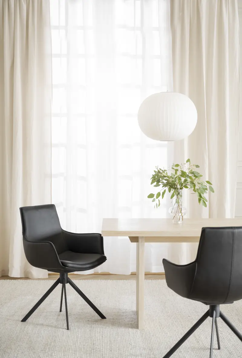 Der Lowell Armlehnenstuhl in schwarzem Echtleder mit einem Drehfuß aus schwarz pulverbeschichtetem Metall ist ein Möbelstück mit hohem Designwert. Der Armlehnenstuhl ist Teil der flexiblen Lowell-Serie, bei der Sie den Armlehnenstuhl nach Ihren Wünschen gestalten können, indem Sie schwarzes oder braunes Echtleder oder grauen Stoff, mit oder ohne Gestell und drehbarem oder festem Fußgestell wählen. Die hohe Qualität, der Sitzkomfort und das stilvolle Design machen Lowell zu einem Stuhl, den Sie viele Jahre lang nutzen und lieben werden. Wird nur im 2er-Pack verkauft.