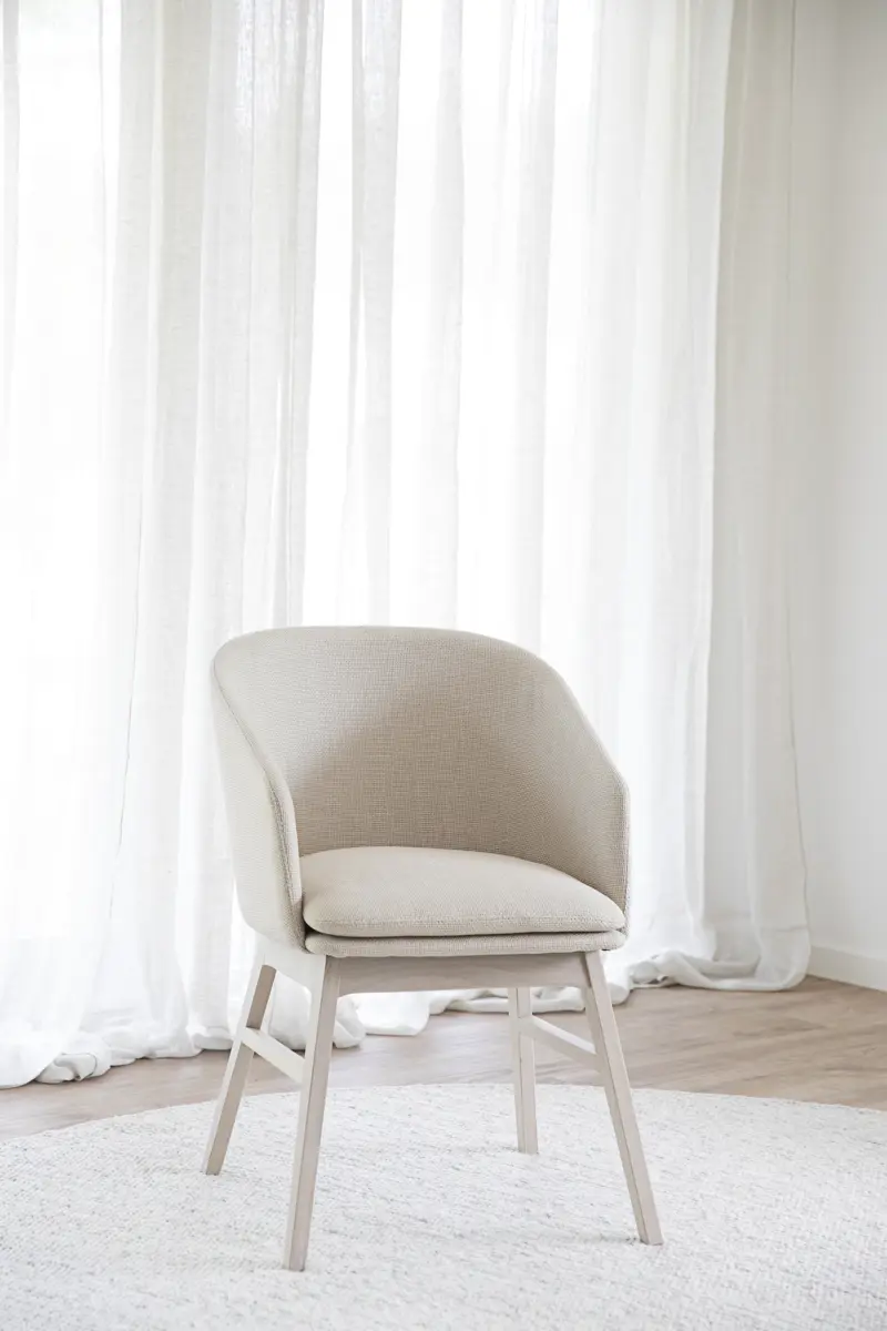 Der Windham Armlehnenstuhl in beigem Stoff mit Beinen aus massiver, weiß pigmentierter Eiche hat einen hohen Sitzkomfort und ist lange Zeit angenehm zu sitzen. Das bodenständige skandinavische Design, die hohe Qualität und das FSC-zertifizierte Holz machen Windham auf Dauer zu einem nachhaltigen Stuhl. Das Sitzkissen hat einen abnehmbaren Bezug. Erhältlich in zwei Stoffen und vier Farben für die Beine aus lackiertem Massivholz. Wird nur im 2er-Pack verkauft.