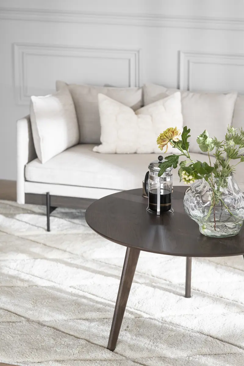 Der runde Couchtisch Yumi mit leicht ausgestellten Beinen hat ein zeitloses skandinavisches Design, das Jahr für Jahr Bestand hat. Der Couchtisch ist Teil der beliebten Yumi Serie, die zu den beliebtesten Serien von Rowico Home gehört. Die Tischplatte ist aus braun lackiertem Eichenfurnier gefertigt. Kombinieren Sie ihn ruhig mit anderen Möbeln aus der Yumi Serie.