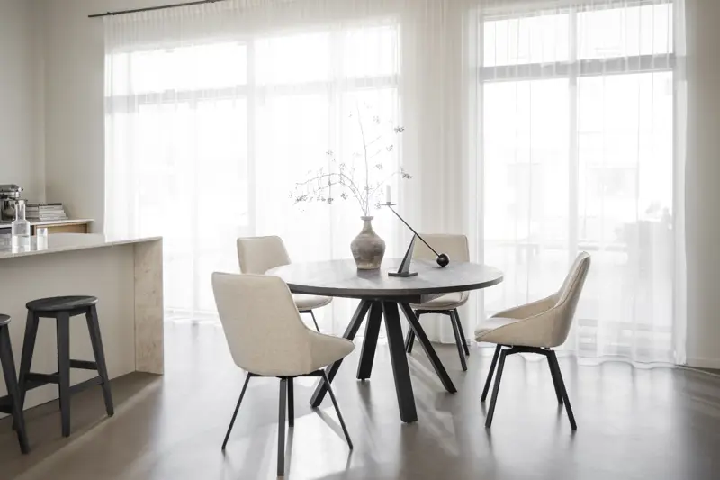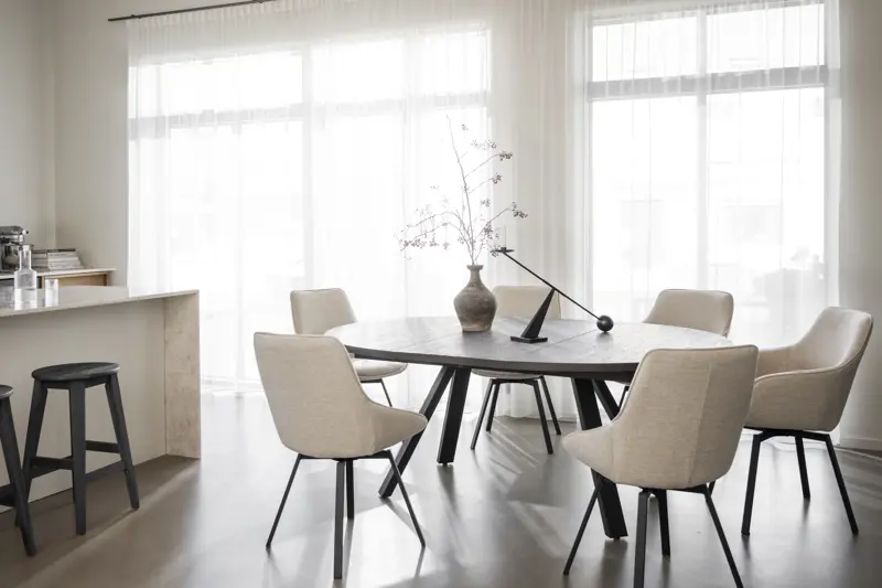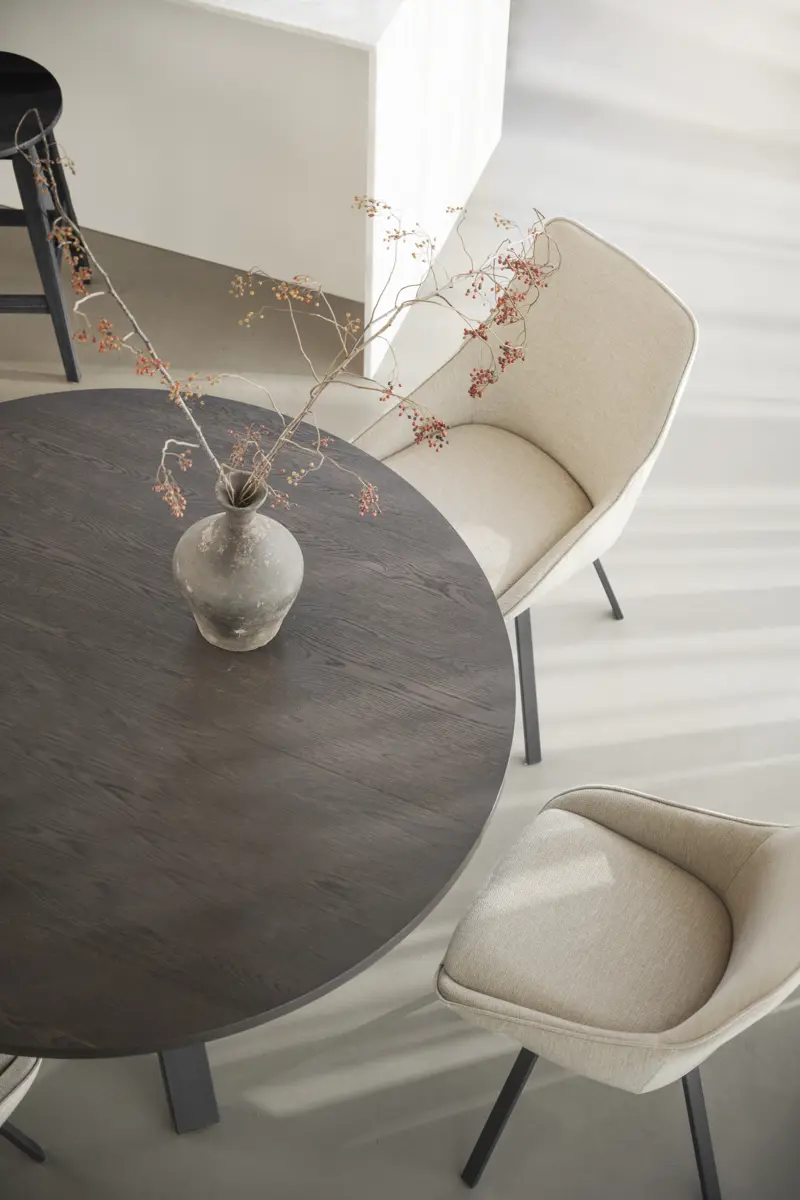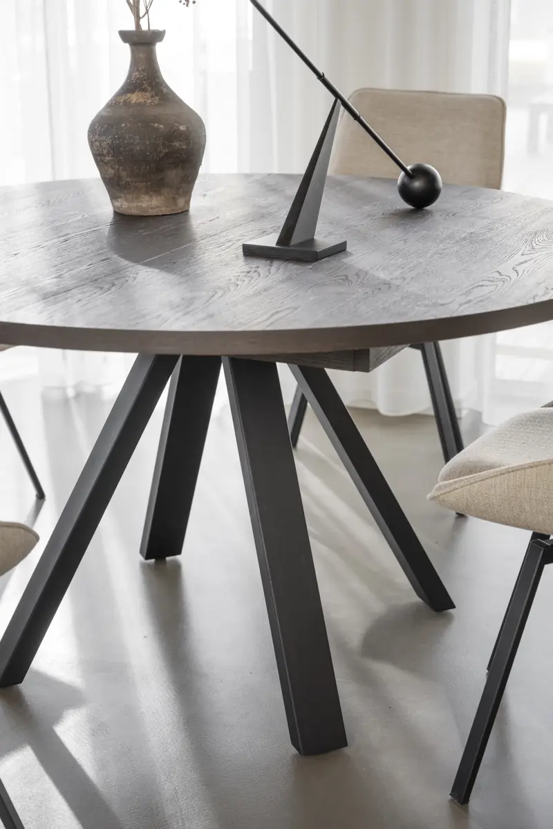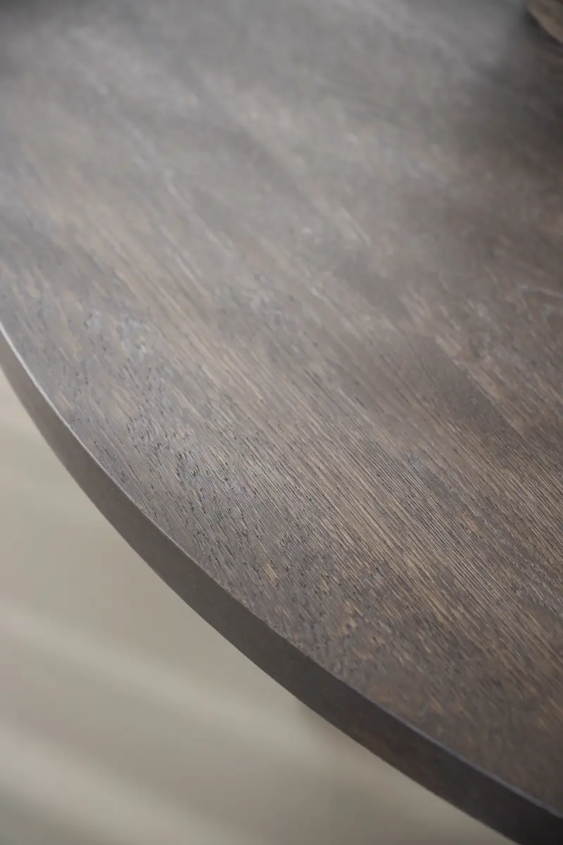 Maddock ist ein praktischer und ausziehbarer runder Esstisch mit einer Tischplatte aus FSC®-zertifizierter braun geölter Eiche und schwarz pulverbeschichteten Metallbeinen. Der Esstisch wird zum Mittelpunkt des Raumes und vermittelt ein solides und stilvolles Gefühl. Schaffen Sie Gemeinschaft und Platz für mehr Personen, indem Sie 1 oder 2 Einlegeplatten hinzufügen und ihn in einen großen ovalen Tisch verwandeln. Dank der Verwendung von Holz mit sichtbaren Astlöchern hat jeder Tisch eine einzigartige Holzoptik. Die Tischplatte ist semi-massiv, d.h. die Platte besteht aus 3 mm massivem Eichenfurnier und ist dadurch sehr langlebig. Hochwertig und langlebig - ein Esstisch, an dem Sie jahrelang Freude haben werden. Auch in geölter Eiche erhältlich.