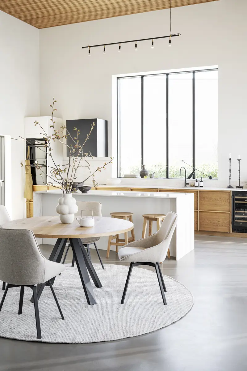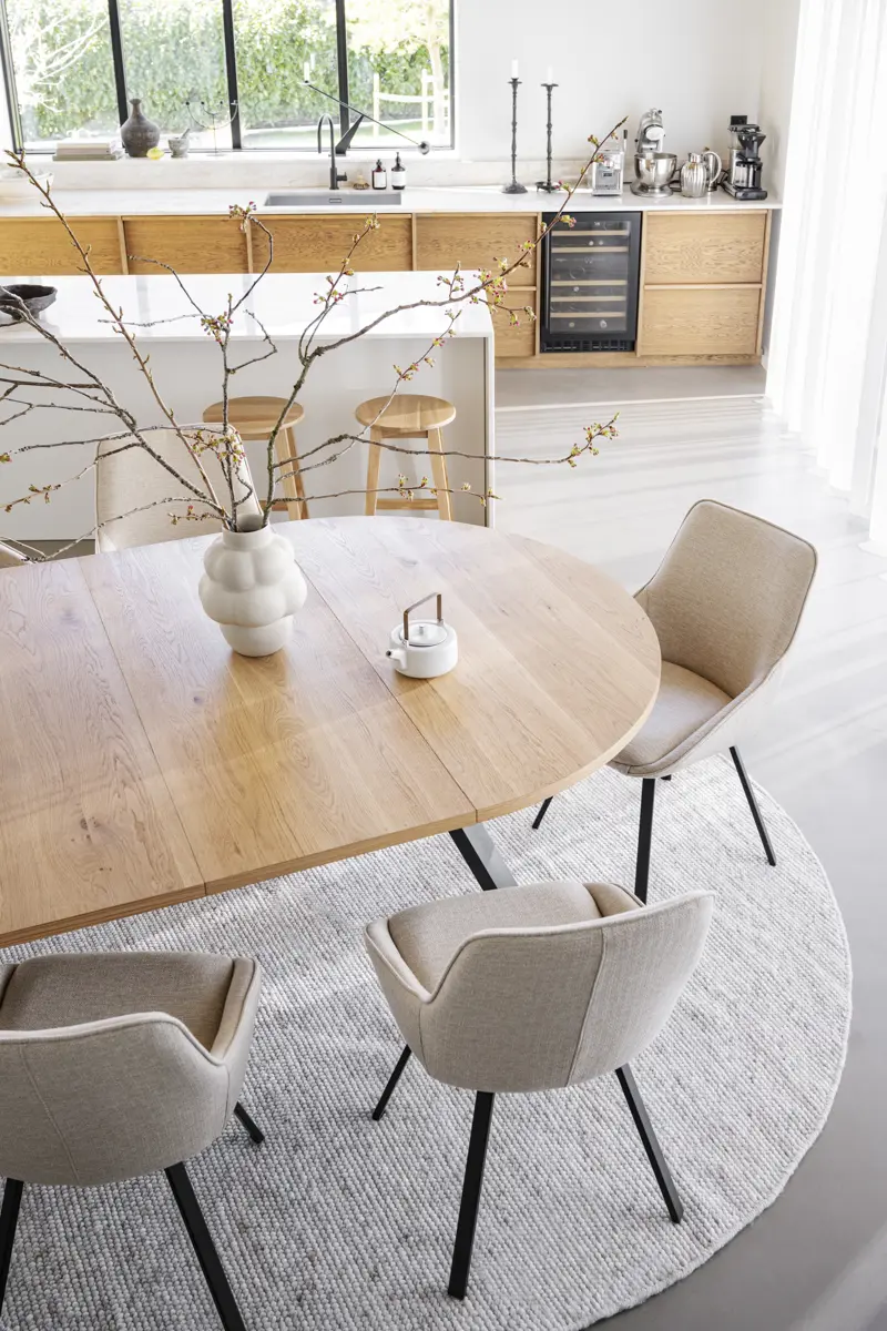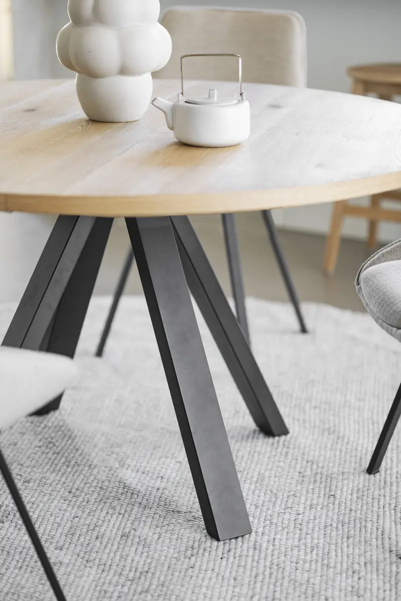 Maddock ist ein praktischer und ausziehbarer runder Esstisch mit einer Tischplatte aus FSC®-zertifizierter geölter Eiche und schwarz pulverbeschichteten Metallbeinen. Der Esstisch wird zum Mittelpunkt des Raumes und vermittelt ein solides und stilvolles Gefühl. Schaffen Sie Gemeinschaft und Platz für mehr Personen, indem Sie 1 oder 2 Einlegeplatten hinzufügen und ihn in einen großen ovalen Tisch verwandeln. Dank der Verwendung von Holz mit sichtbaren Astlöchern hat jeder Tisch eine einzigartige Holzoptik. Die Tischplatte ist semi-massiv, d.h. die Platte besteht aus 3 mm massivem Eichenfurnier und ist dadurch sehr langlebig. Hochwertig und langlebig - ein Esstisch, an dem Sie jahrelang Freude haben werden. Auch in Eiche braun geölt erhältlich.