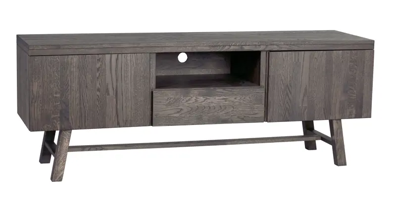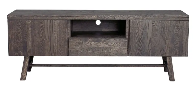 Sleek TV stand in solid finger-jointed European oak that has been stained dark brown and lacquered. It features a practical cable management hole at the back and soft-close function on the drawer and doors. The TV stand is part of our popular Brooklyn series, where all parts are FSC® certified.