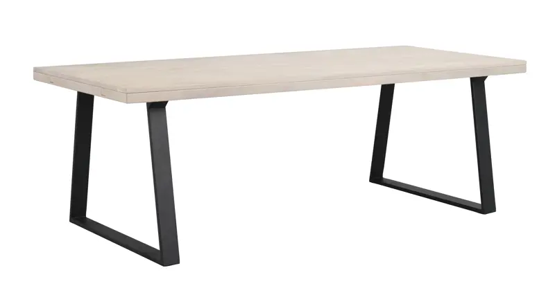 Massiv fingerskarvad Europeisk ek i vitpigmenterad olja. Utdragsreglar till tilläggsskivor i massiv ek. Ben i pulverlackad metall med sandstruktur.