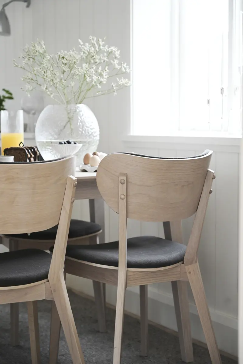 Stolen Kato i massiv vitpigmenterad och FSC-certifierad ek andas skandinavisk design och har en stoppad sits och ryggbricka av slitstarkt mörkgrått tyg. Den rundade ryggbrickan gör trästolen väldigt bekväm, perfekt för matplatsen där stilren design möter skön komfort. Finns i flera färger. Säljs endast i 2-pack.
