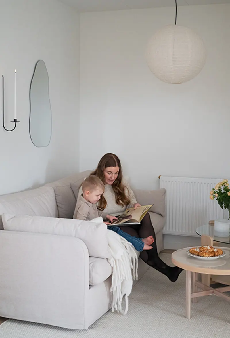 Utöver matplatsen älskar familjen att vara i sitt vardagsrum, en plats för både avkoppling och samvaro. Här har de skapat en harmonisk atmosfär med soffan Peyton och soffborden Marsden och Arran, som de har mixat för att skapa kontraster med olika material. Under soffan och soffborden ligger den vackra mattan Auckland, som binder ihop rummet och skapar en inbjudande känsla. En av familjens favoritstunder är när de kryper upp i soffan och läser böcker tillsammans – en stund av lugn och närhet i vardagen.