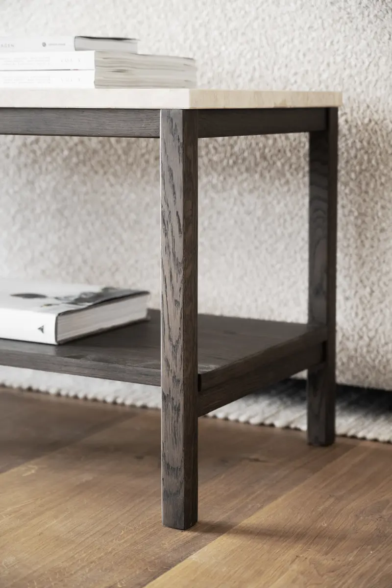 Massiv italiensk travertin sten i toppen, ben och stomme i massiv ek, hyllplan i MDF med ekfanér.